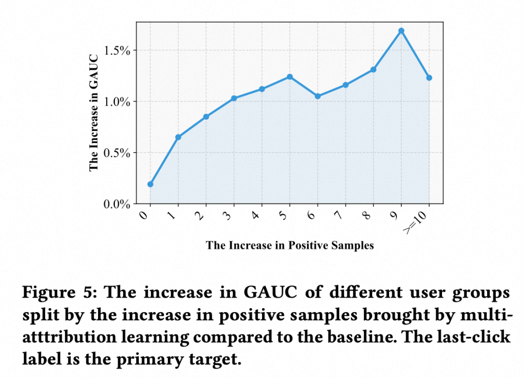 为了进一步理解MAL范式所带来的提升来源,我们将测试数据中的用户按照「Linear归因正样本数减去Last-Click归因正样本数」的代理指标进行分组,计算各组GAUC相对基线模型的提升幅度。正样本增量这一代理指标表示引入MAL建模范式后,各用户在预估系统中所得的监督信号增量大小。