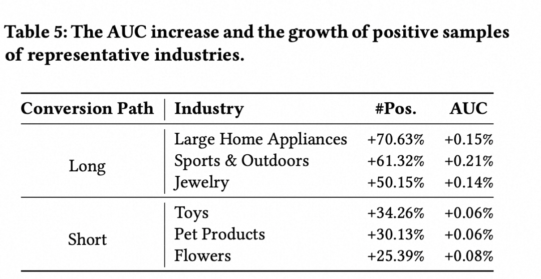 尤其值得注意的是,如下表所列,那些转化路径较长的行业,例如大家电和珠宝,获得了最高的AUC增长;而转化路径较短的行业,例如宠物用品和玩具,其AUC增幅则显著偏低。这一结果与用户分组分析一致,充分表明MAL有效地利用了多元归因机制所提供的增量信息。