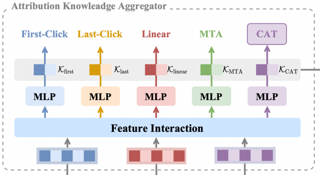 如下图所示,归因知识聚合模块(Attribution Knowledge Aggregator,简称AKA)中,每种归因口径产出的转化标签都对应一个负责预估的MLP模块,我们称之为各辅助任务预估头。设某种归因口径