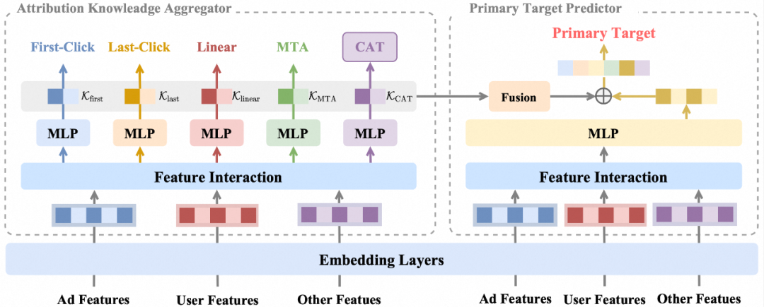 为了实现MAL范式的上述优化目标,我们设计了一套由归因知识聚合模块AKA与主目标预估头PTP组合成的模型架构(详见2.2节)。此外,在各归因机制产生的辅助目标基础上,我们创新性地提出了笛卡尔积辅助训练目标CAT(详见2.3节)。下图展示了我们MAL建模范式实践方案的整体框架。