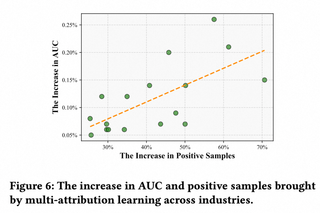 为了更深入地理解MAL范式革新对整个广告系统的影响,我们将测试样本按广告主行业进行分组,并分别计算了各行业内的AUC指标。如下图所示,所有行业的AUC均有提升,并且那些正样本数量增长更多的行业,其AUC增幅也更大。