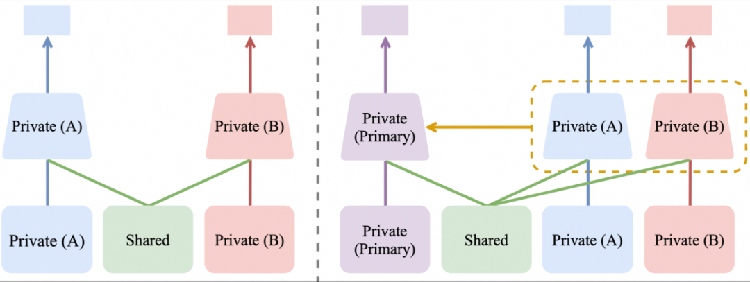 图3. 多任务学习架构(左) v.s. MAL模型架构(右)