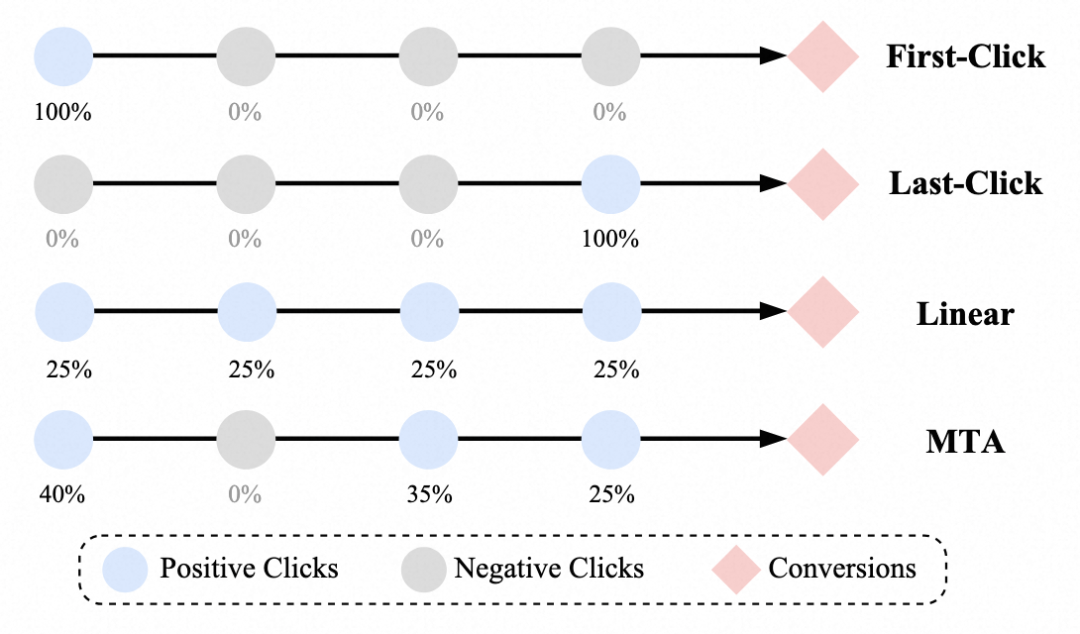 在广告系统中,系统会通过归因机制将转化结果(例如成交)归因到用户转化旅程中的各个触点上,以此评估广告投放效果并进行优化。虽然业界已提出多种归因机制(如 First-click,Last-click,Linear,MTA,etc),但考虑到实践上的简便性,目前主流广告系统中都只面向一种特定的目标归因机制进行优化(通常是 Last-Click 口径归因)。