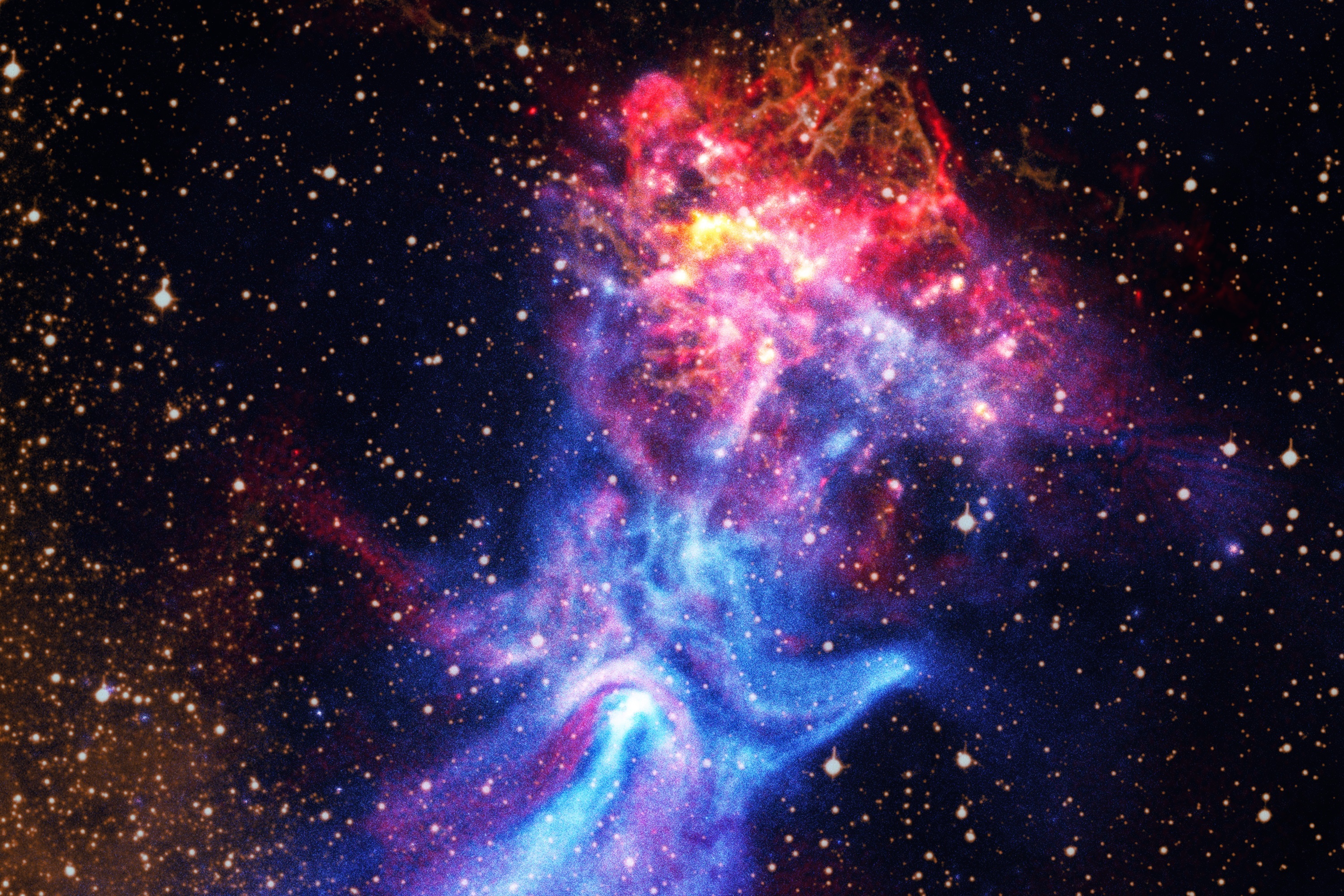 NASA 公布一张圆规座「MSH 15-52」脉冲星风云的新照片。这张照片由钱德拉X射线天文台和澳大利亚望远镜致密阵列(ATCA)观测数据合并而成,中央区域如同手掌一样的蓝色星云是脉冲星「B1509-58」喷射的带电粒子。天文学家推测这颗脉冲星由一个大质量恒星塌缩形成,直径仅19公里,自转速度高达每秒7圈,拥有强度相当于地球磁场15万亿倍的超强磁场。摄影师:NASA