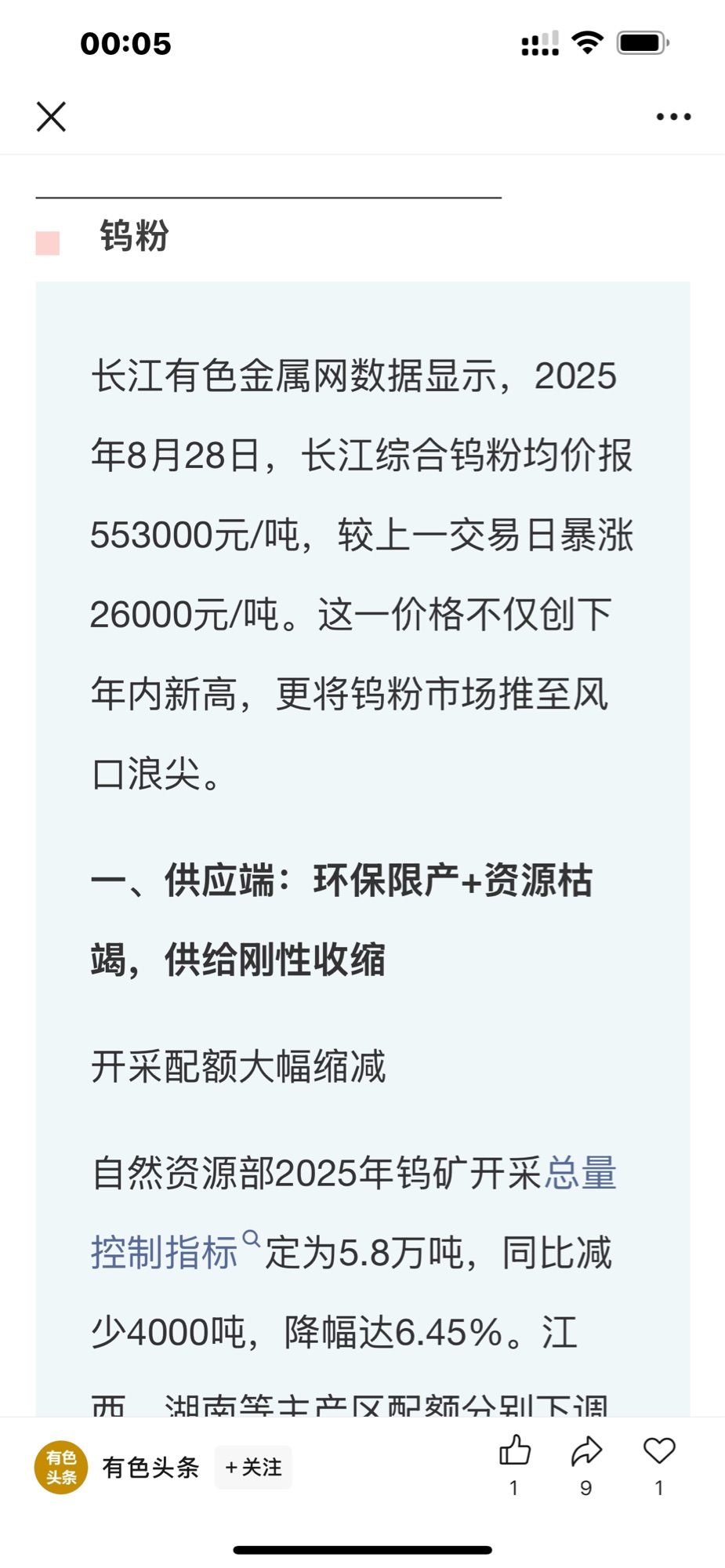 【钨粉单日飙涨26000元!军工订单需求激增+资源枯竭环保限产+出口管制原料涨价+供给刚性收缩,钨粉价狂飙至风口浪尖】 2025年8月28日,长江有色金属网数据显示,长江综合钨粉均价报553000元/吨,较上一交易日暴涨26000元/吨。这一价格不仅创下年内新高,更将钨粉市场推至风口浪尖。 一、供应端:环保限产+资源枯竭,供给刚性收缩开采配额大幅缩减自然资源部2025年钨矿开采总量控制指标定为5.8万吨,同比减少4000吨,降幅达6.45%。江西、湖南等主产区配额分别下调8%和6%,部分低产区指