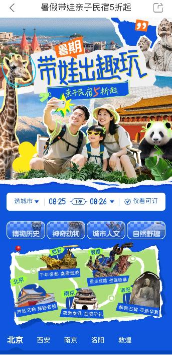 途家民宿只保留了暑期亲子游专题活动,围绕古都、动物园等城市特色分为四类主题,从推荐房源来看,仍然聚焦4居及以上整租房源,主要客群仍然为商旅用户全家/多人度假需求。活动没有额外优惠释放,主要为常规优惠+消费积分抵现。