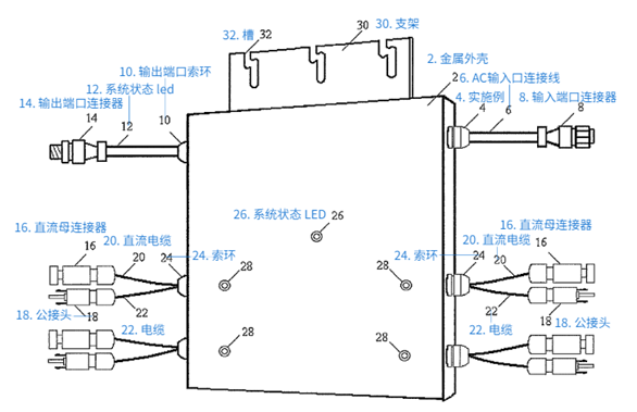 主题为Enclosure and message system of smart and scalable power inverters(太阳能电池连接装置),申请日为2012-06-29,于2016-05-03授权,预计权利到期日为2034-12-17。