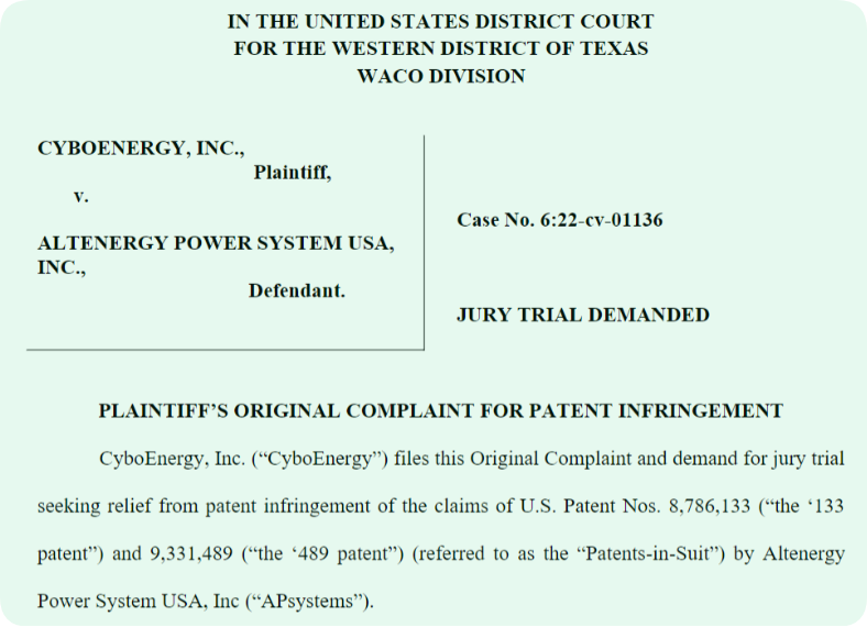 根据起诉状的内容显示,CyboEnergy是特拉华州的一家公司,其主要营业地位于加利福尼亚州的萨克拉门托,CyboEnergy 是世界上第一个太阳能微型逆变器 CyboInverter 的开发商,具有中央逆变器和微型逆变器的关键优点。