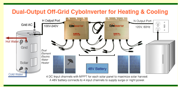 CyboInverter提供并网、离网、并网/离网、双输出离网和交流辅助离网功能 。CyboEnergy 独特的专利无电池离网 CyboInverters 用于电热水器、光伏空调和交流辅助离网 ,可以帮助解决电网“鸭子曲线”问题并改变太阳能行业的格局。
