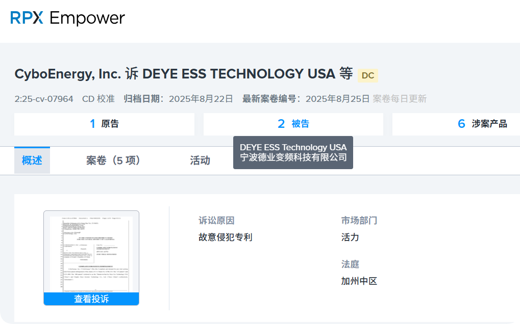 2025年8月22日,美国太阳能逆变器制造商CyboEnergy(赛博能源公司 ,以下简称“赛博能源”)在美国加州中央地方法院对Deye Ess Technology USA(德业储能科技美国有限公司)和Ningbo Deye Inverter Technology Co Ltd(宁波德业变频技术有限公司)提起专利侵权诉讼,指控德业的微型逆变器侵犯了其太阳能逆变器的智能、可扩展和用户界面技术相关专利。