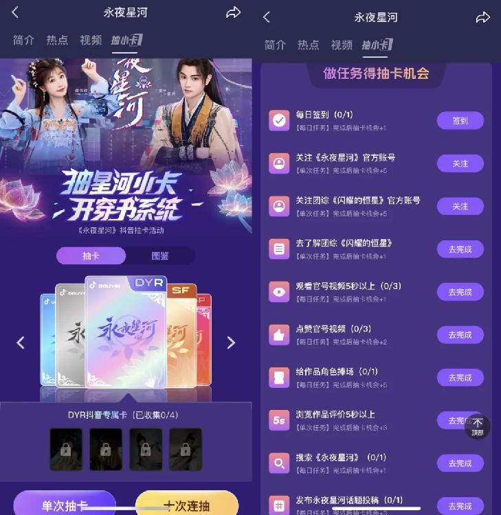 2024年2月,抖音正式上线影视评论功能,腾讯视频的《永夜星河》入驻后,很快成为2024年站内影视类评论数量第一名,该剧还加入了抽卡活动,包括SP卡(主创签名)、SSR稀有卡、SR超稀有卡等,内容涵盖角色单人剧照、经典名场面等珍贵素材。