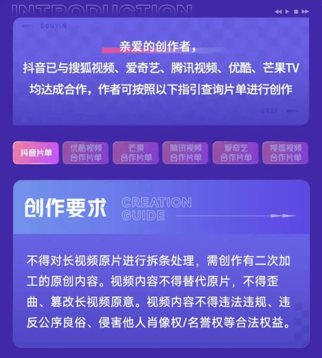 根据协议要求,创作者不得简单将长视频内容拆条发布,而必须进行实质性二次加工,产出具有原创价值的内容。允许的创作形式包括但不限于视频解说、观点杂谈、创意混剪等,旨在推动“二创”内容向规范化、高质量方向发展。