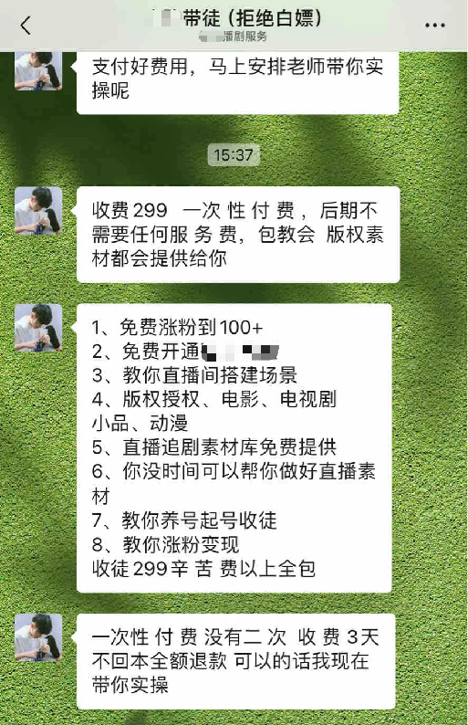 新识研究所在加了这些博主后,他们往往会收取288-588元的“拜师费”,提供包括剪辑手法、影视资源渠道、投稿注意事项和平台监管细节等实操内容。但当询问影视素材是否有版权时,大部分博主都直言“没有版权”或“不需要版权”,但可以通过剪辑、配音解说等方式来规避审核风险。