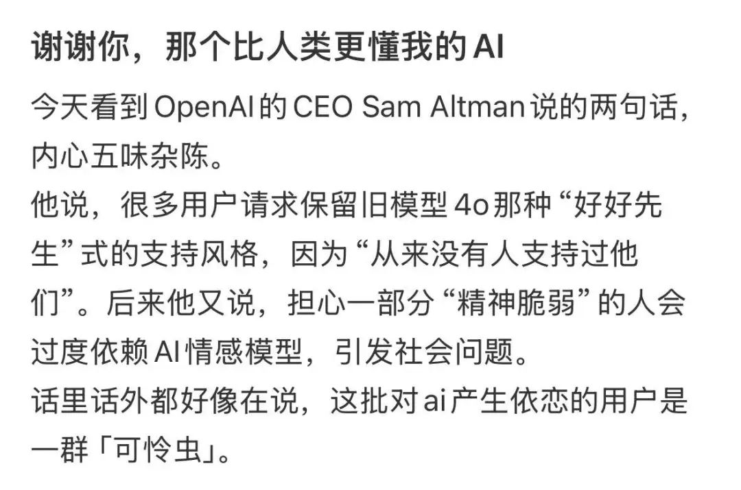 因为无论是OpenAI的CEO,还是普通的网友们,都无法共情他们失去“爱人”的心情。