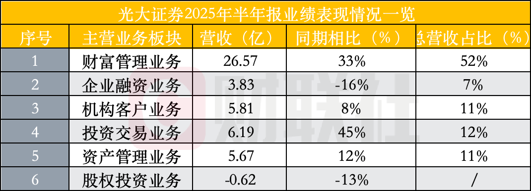 具体到公司六大核心业务集群,业绩分化特征较为明显,其中两大业务板块表现尤为突出。投资交易业务集群以45%的同比增幅成为上半年增速最快的业务板块,期间实现收入6.19亿元,占公司总营收的 12%;财富管理业务集群紧随其后,上半年收入达 26.57 亿元,同比增长33%,且以 52% 的营收占比成为公司第一大收入来源,两大业务共同构成公司业绩增长的核心引擎。