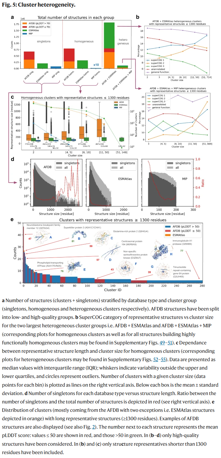 在 AFDB 与 ESMAtlas 的高质量结构中,大部分形成异质性簇,说明它们在结构上高度相似。然而,仍存在部分同质性簇和单例,显示出数据库间的差异。异质性簇的功能分布更丰富,表明跨数据库的聚合有助于揭示更广泛的生物学多样性。