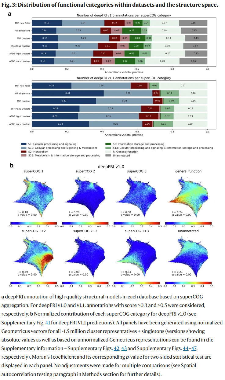 基于 deepFRI 的功能注释结果表明,高层次功能类别(如代谢、信息存储与处理、细胞过程与信号传导)在结构空间中表现出明显的空间集中性。不同功能类别的分布并非随机,而是呈现显著的空间自相关性。这种“功能局域性”说明蛋白质功能可通过结构空间中的位置得到有效预测。