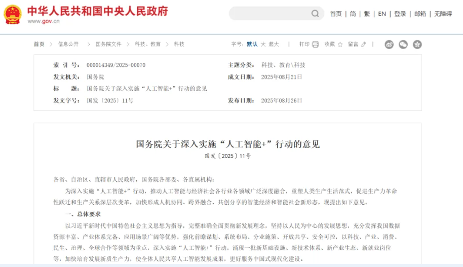 近日,国务院印发《关于深入实施“人工智能+”行动的意见》(以下简称《意见》),旨在推动人工智能与经济社会各行业各领域广泛深度融合,重塑人类生产生活范式,促进生产力革命性跃迁和生产关系深层次变革,加快形成人机协同、跨界融合、共创分享的智能经济和智能社会新形态。