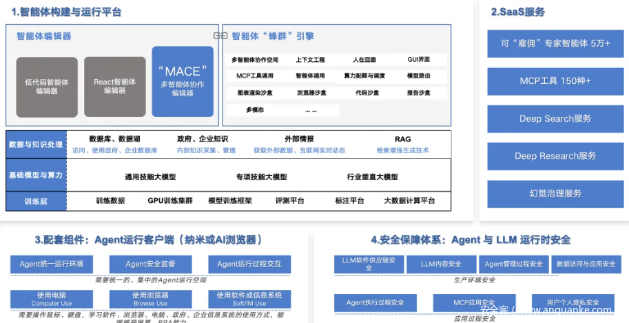 为推动智能体在各行业的普及应用,360打造了企业智能体工厂SEAF,为企业提供基础设施(算力、模型和路由)、AI知识库、智能体编辑器、SaaS服务及工具能力、蜂群引擎、客户端、AI安全等体系化建设能力,无需任何编码基础即可让企业打造符合自己业务的智能体应用,促进真正的企业AI业务落地,推动企业生产力和生产效率的变革,携手共建人工智能产业规模化落地的新阶段。