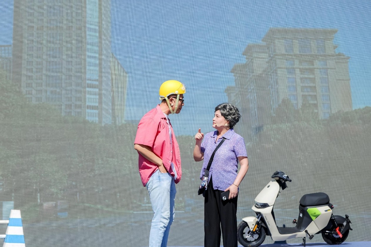 启动仪式后,杭州滑稽艺术剧院带来的主题演出精彩纷呈。音乐快板《快板声声话文明》用节奏传递安全知识,小品《拦不住》、《外卖小哥》、《十字路口》还融入了九号电动车安全稳定的性能,聚焦骑手群体出行风险,在笑声中引发共鸣;杭州杂技总团的《蝶恋双人技巧》则以艺术之美诠释交通秩序的重要性。“节目既好看又实用,知道了骑电动车不仅要戴头盔,还要定期检查电池安全。”市民李女士带着孩子看完演出,对安全知识有了更深理解。