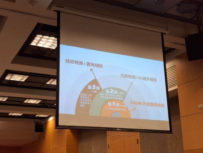 蔡福隆提到目前規畫分為3級,第1級針對A、B級機關進行EASM外部曝險檢測,檢測外網是否存在風險;第2級則是遴選行政院的2級機關或是曾受資安會報稽核的機關,作內部檢測並利用AI作場外監控、稽核;第3級檢測則是遴選前2級較高風險及未曾受資安會報稽核的機關,進行技術檢測及實地稽核。