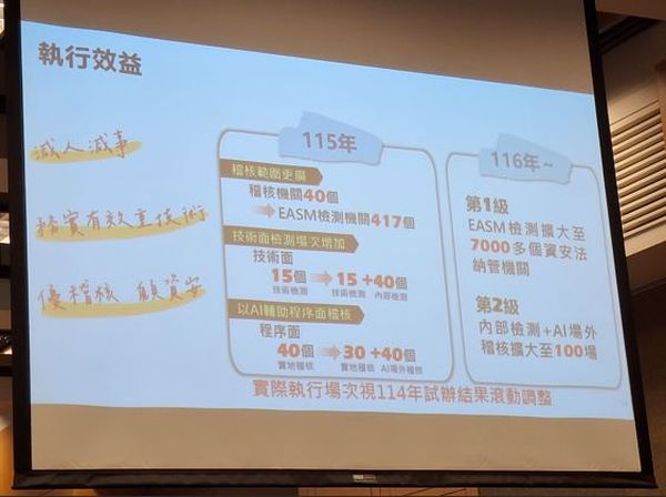 今年先試辦分級制度,明年計畫擴大稽核能量,2026年從原先稽核40個機關擴大為EASM檢測417個機關;在技術面檢測方面,從原本的15個場次提升為15個技術檢測加上40個內部檢測;至於AI輔助的程序面稽核,從原本的40個實地稽核擴大為30個實地稽核加上40個AI場外稽核。到了2027年,第1級EASM檢測機關將擴大到資安法納管的7,000個機關;第2級內部檢測加上AI場外稽核將擴大到100場。