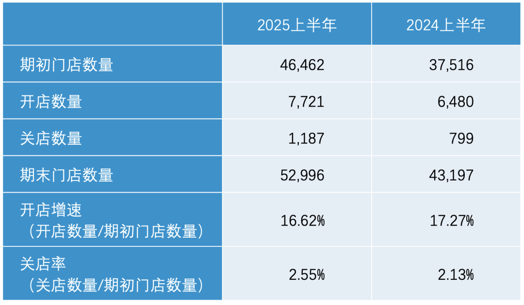 计算的结果是:2025上半年开店增速为16.62%,较去年同期的17.27%有所下降,2025上半年的关店率为2.55%,较去年同期的2.13%升幅较大。