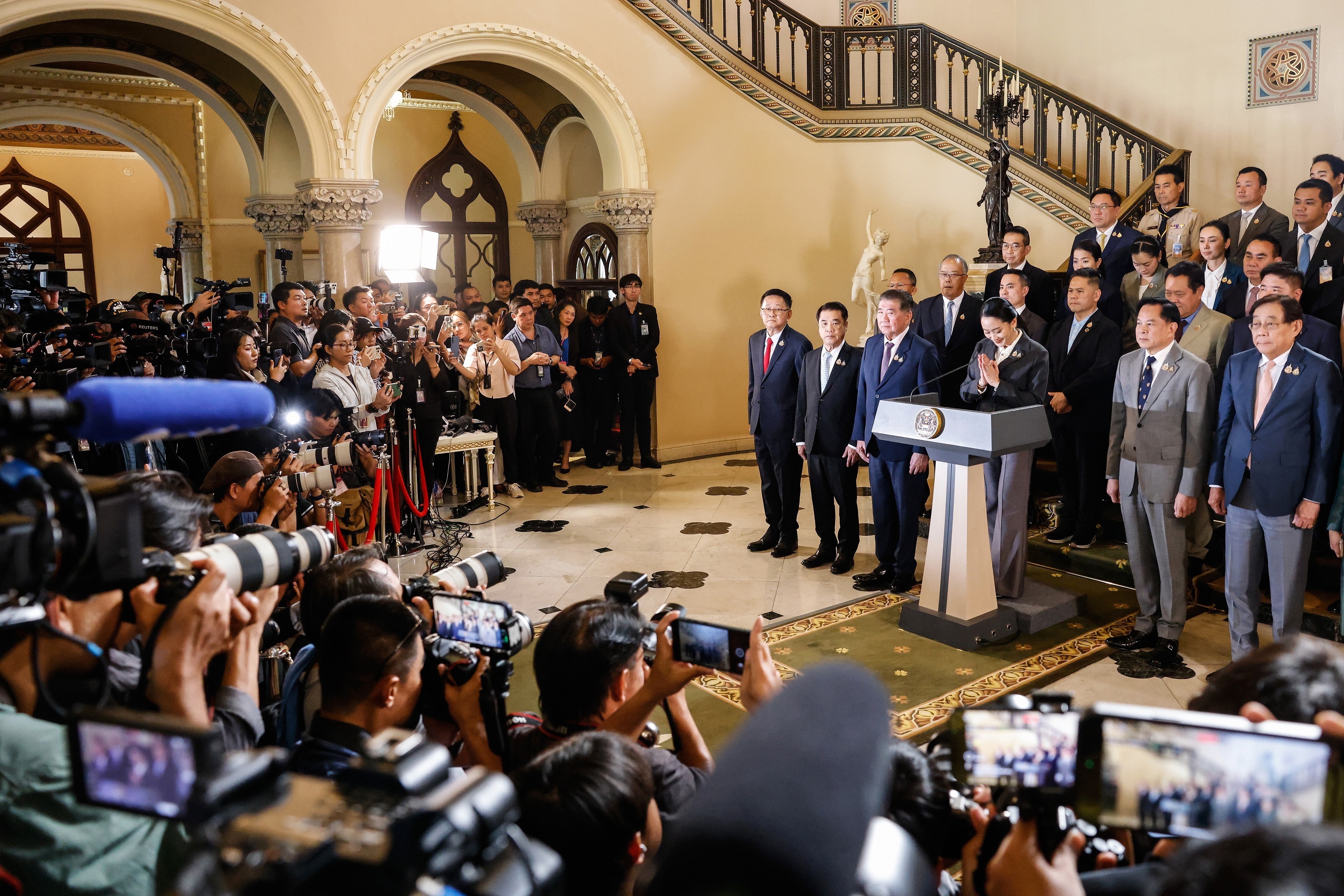 泰国总理 Paetongtarn Shinawatra 遭宪法法院解职后向媒体发表讲话,曼谷。8月29日,泰国宪法法院以6:3投票结果裁定现任总理 Paetongtarn 与柬埔寨参议院主席洪森的通话内容「有损国家声誉和道德规范」,即日起终止其总理职务。现年39岁的 Paetongtarn 表示接受裁决结果,但重申她的通话初衷是为了缓和泰柬边境紧张局势并挽救国民生命。Paetongtarn 于2024年当选成为泰国史上第二位女性总理和最年轻总理,亦是继其父亲他信、姑父颂猜和姑姑英拉之后来自西那瓦家族的第4位总理。摄影师:Dario Pignatelli