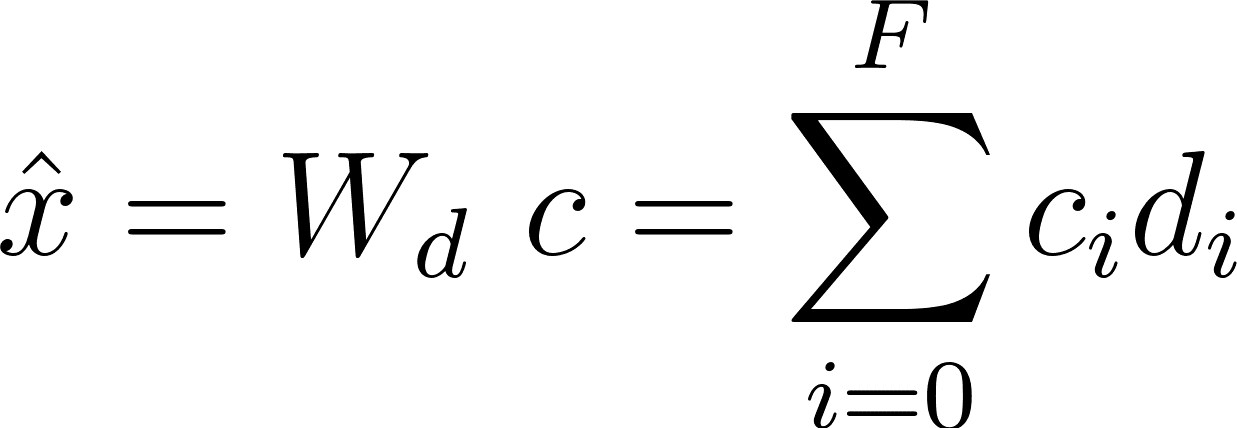 The decoder reconstructs the original input vector using a weighted sum of the coefficients and the learned feature vectors: