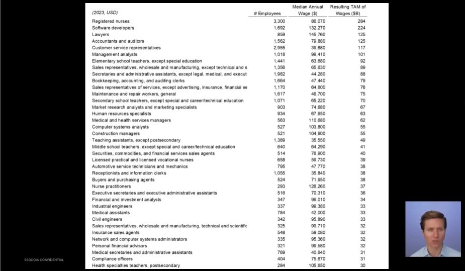 这张图是首次公开,节选自红杉内部的一份备忘录,按市场潜力对服务业岗位进行了排序。最右侧的数值是根据美国人口普查局的数据,将每个岗位的员工数量与年薪中位数相乘得出的。这张图直观展示了各细分市场的潜力 (TAMs),并且红杉已在这些领域进行了投资。