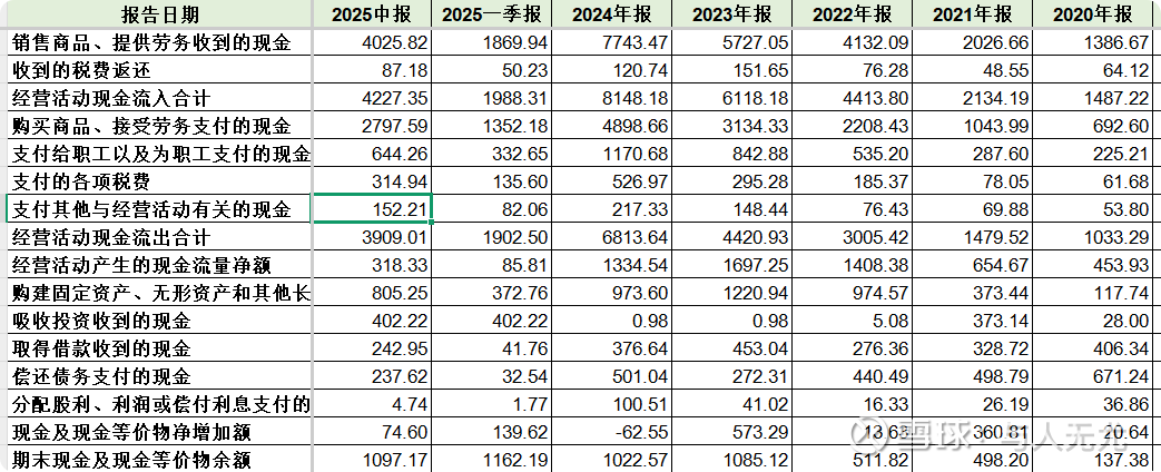 经营活动产生的现金流量净额是318亿,看着是还不错,但是一看购建固定资产等长期资产支付的现金,805亿,半年时间投资花掉的钱快要接近去年一年了,其中2季度支付了432亿,这个花钱速度真的挺夸张的。