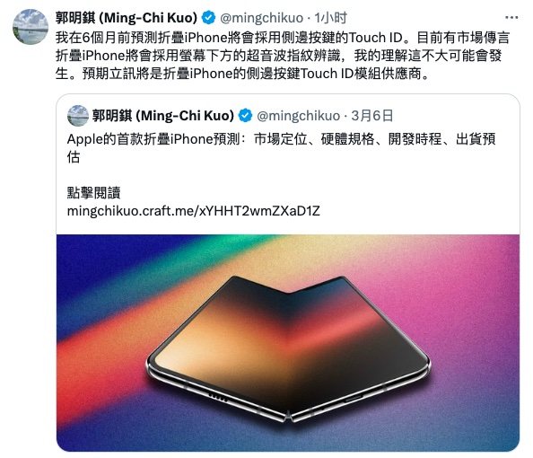 郭明錤表示,他在 6 个月前预测可折叠 iPhone 将会采用侧边按键的 Touch ID。目前市场上有传言称可折叠 iPhone 将采用屏幕下方的超声波指纹识别,但他认为这不太可能实现。
