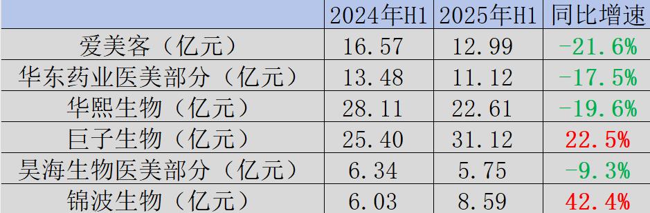 各大医美企业披露的2025年中报中,除正处于业绩释放阶段的锦波生物和巨子生物外,其他医美头部公司均出现不同程度的营收滑坡,这足以说明医美产品的供需天平正在向另一端倾斜。
