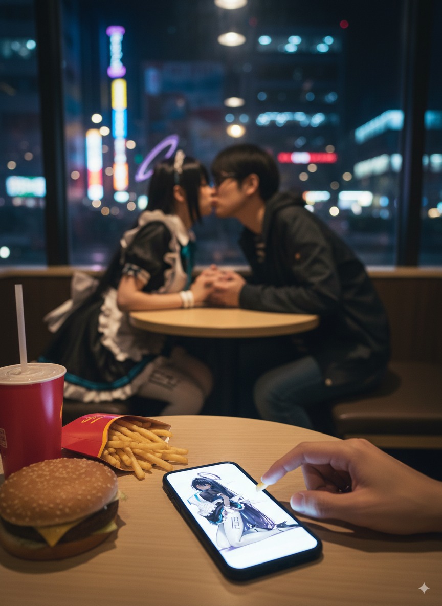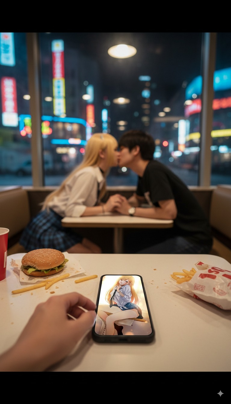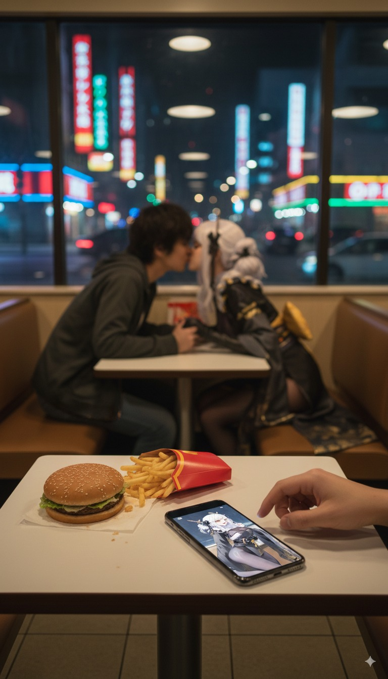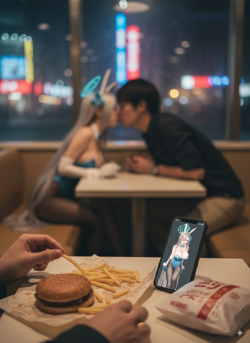 我把推友Tz大神的提示词稍微改良了一下,也分享在这里:<br>A cinematic scene inside a fast food restaurant at night. <br>Foreground: a lonely table with burgers and fries, and a smartphone shown large and sharp on the table, clearly displaying the uploaded anime/game character image. <br>A hand is reaching for food, symbolizing solitude. <br><br>Midground: in the blurred background, a couple is sitting together and kiss. <br>One of them is represented as a cosplayer version of the uploaded character: <br>- If the uploaded character is humanoid, show accurate cosplay with hairstyle, costume, and signature props. <br>- If the uploaded character is non-humanoid (mecha, creature, mascot, etc.), show a gijinka (humanized cosplay interpretation) that carries clear visual cues, costume colors, and props from the reference image (armor pieces, wings, ears, weapon, or iconic accessories). <br>The other person is an ordinary japan human, and they are showing intimate affection (kissing, holding hands, or sharing food). <br><br>Background: large glass windows, blurred neon city lights outside. <br>Mood: melancholic, bittersweet, ironic, cinematic shallow depth of field.<br><br>[reference: the uploaded image defines both the smartphone display and the cosplay design, with visible props emphasized]<br><br>Image size is 585px 1024px<br><br>