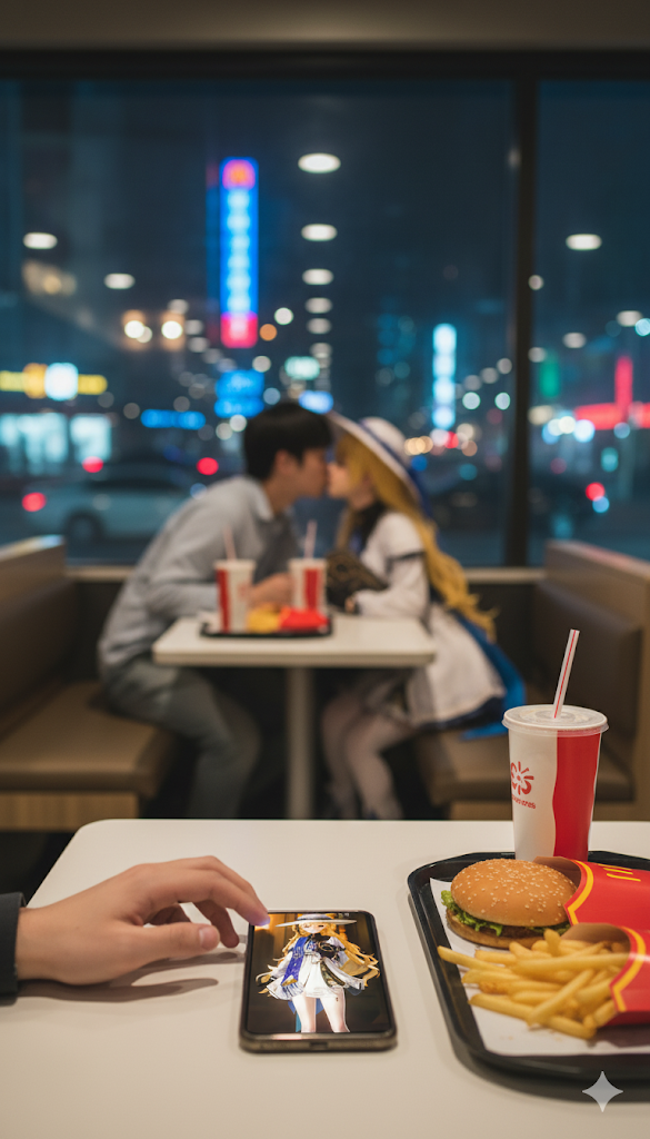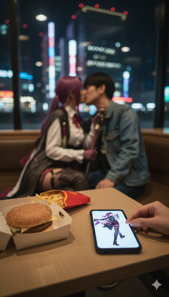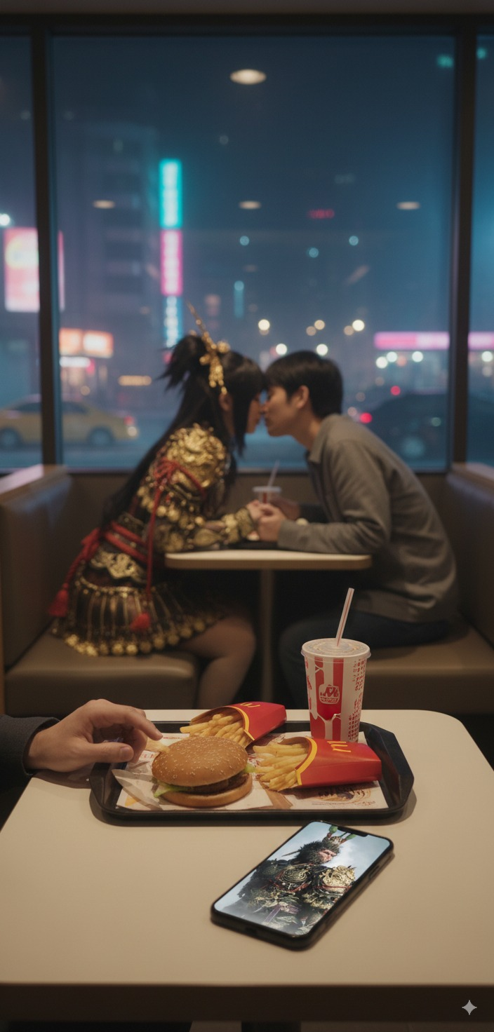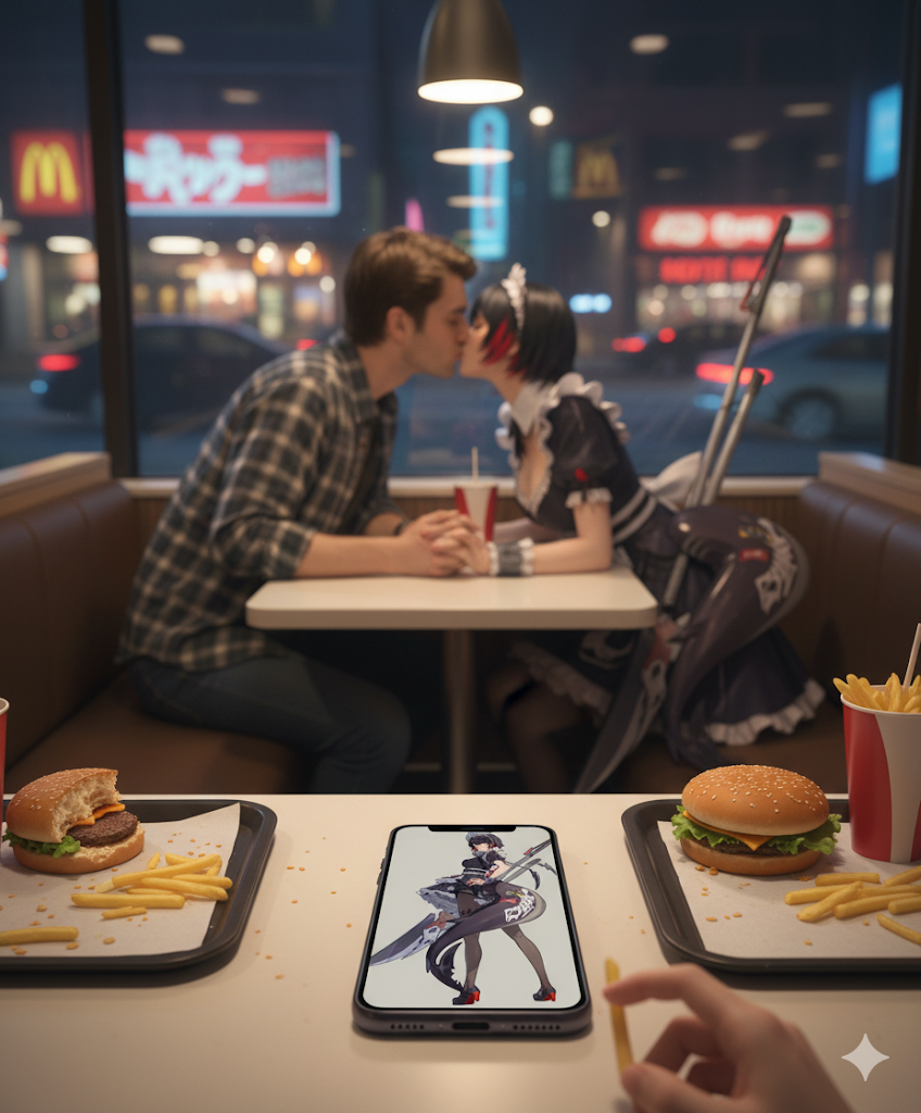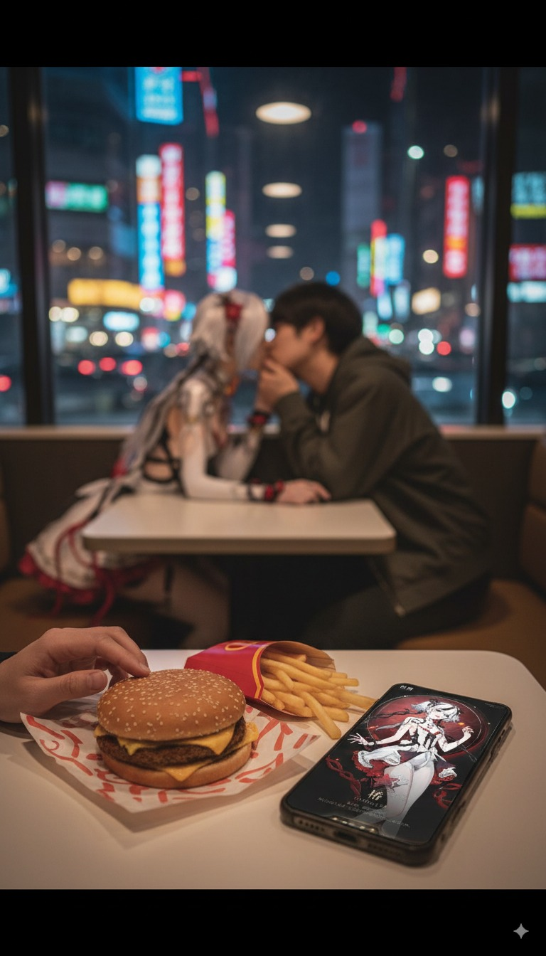 我把推友Tz大神的提示词稍微改良了一下,也分享在这里:<br>A cinematic scene inside a fast food restaurant at night. <br>Foreground: a lonely table with burgers and fries, and a smartphone shown large and sharp on the table, clearly displaying the uploaded anime/game character image. <br>A hand is reaching for food, symbolizing solitude. <br><br>Midground: in the blurred background, a couple is sitting together and kiss. <br>One of them is represented as a cosplayer version of the uploaded character: <br>- If the uploaded character is humanoid, show accurate cosplay with hairstyle, costume, and signature props. <br>- If the uploaded character is non-humanoid (mecha, creature, mascot, etc.), show a gijinka (humanized cosplay interpretation) that carries clear visual cues, costume colors, and props from the reference image (armor pieces, wings, ears, weapon, or iconic accessories). <br>The other person is an ordinary japan human, and they are showing intimate affection (kissing, holding hands, or sharing food). <br><br>Background: large glass windows, blurred neon city lights outside. <br>Mood: melancholic, bittersweet, ironic, cinematic shallow depth of field.<br><br>[reference: the uploaded image defines both the smartphone display and the cosplay design, with visible props emphasized]<br><br>Image size is 585px 1024px<br><br>