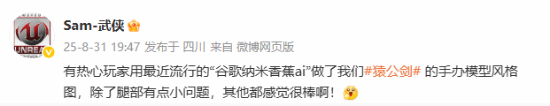 8月31日,国产动作角色扮演游戏猿公剑的制作人@Sam-武侠在微博上分享了一张图片,展示了玩家利用近期流行的谷歌AI图像编辑模型“Nano Banana”创作的猿公剑手办风格作品。@Sam-武侠在评论中表示:“除了腿部有点小问题,整体效果非常出色。”