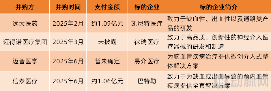 之后,迈得诺医疗集团、迈普医学、信立泰旗下信泰医疗陆续宣布收购神经介入企业。