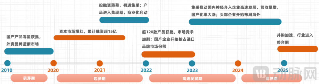 产业并购是行业整合期的典型表现。从2020年爆火到现在不过短短5年时间,神经介入领域就开始高频并购。行业已经进入整合期了吗?为更好地判断,我们梳理了国内神经介入领域发展史。