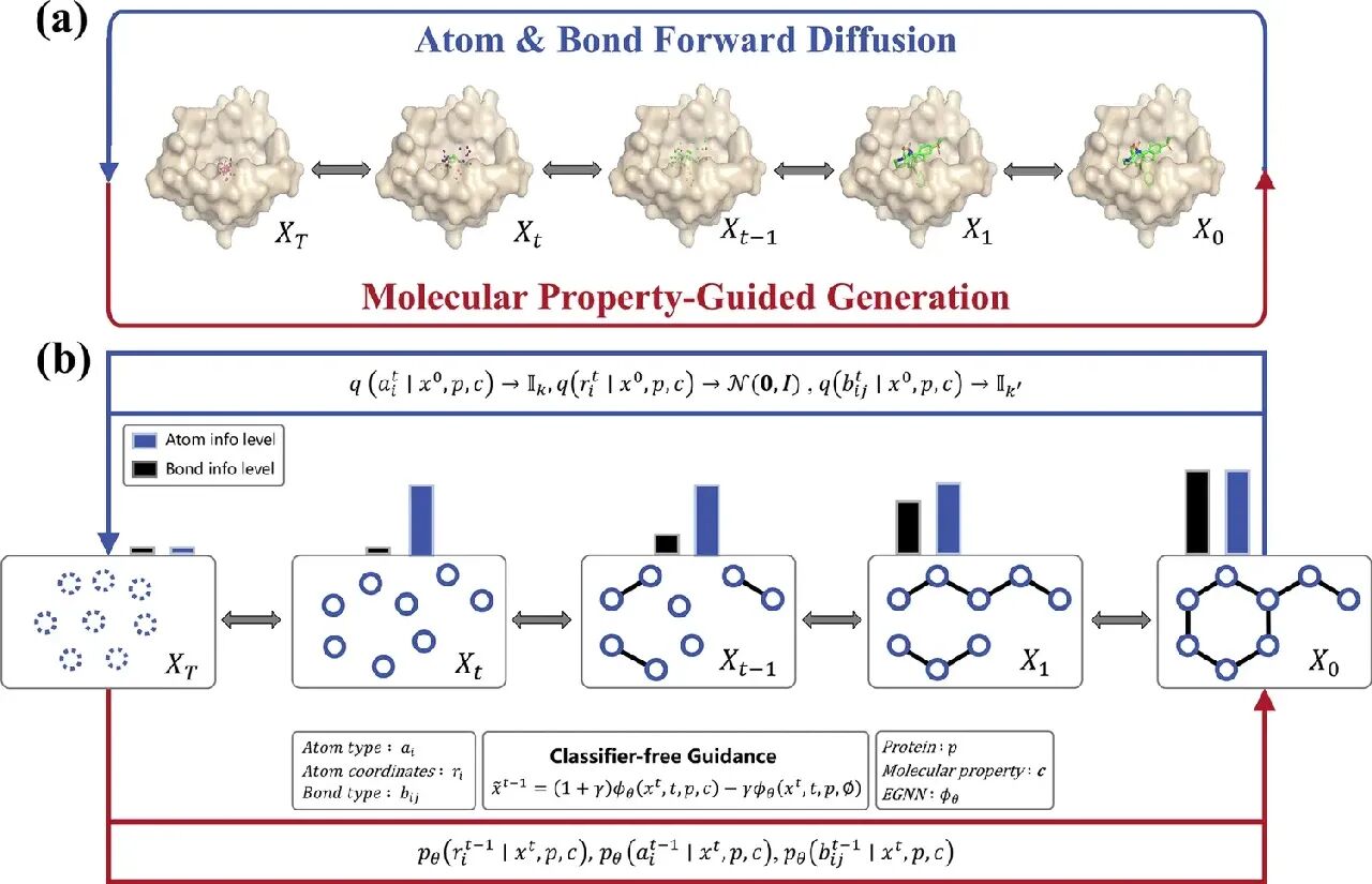 DiffGui模型的创新框架DiffGui提出了一种融合原子-键协同扩散与多属性引导的双机制生成框架(图1)。