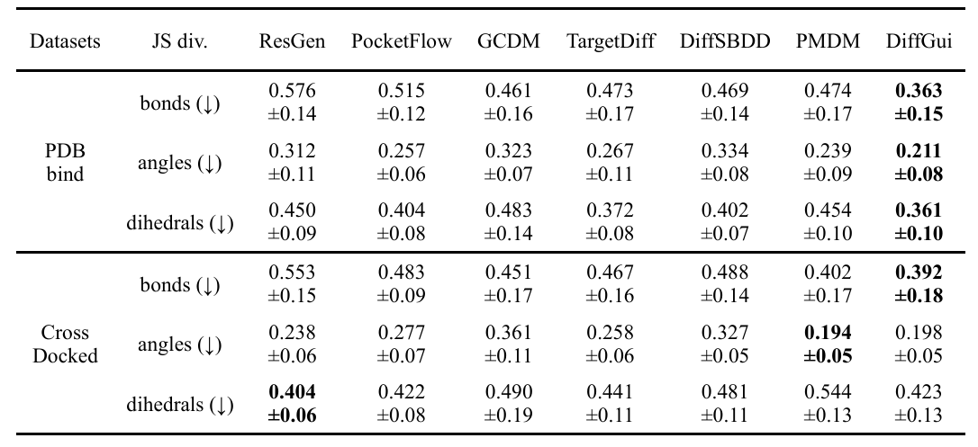 DiffGui生成分子的结构评估DiffGui 模型在多项评估中都展现出卓越的性能,超越了现有SOTA (State-of-the-Art) 模型。在分子结构合理性方面,DiffGui 生成的分子与真实分子的键长、键角和二面角分布高度相似(表1),其全原子对距离的 Jensen-Shannon (JS) 散度也远低于其他模型。特别是在PDBbind数据集上,DiffGui 的C-C键距离JS散度仅为0.1815,全原子对距离JS散度更是低至0.0486(图2),显示出极高的结构准确性。此外,DiffGui生成的分子中五、六元环占比超过95%,与真实药物分子的环系分布高度吻合。在分子构象准确性方面,DiffGui 生成的分子构象与RDKit优化/预测构象的均方根偏差 (RMSD) 值稳定在1.0 Å左右,这避免了因产生片段化分子或计算简化而导致的伪低RMSD值(分子结构不完整)的问题(图3)。