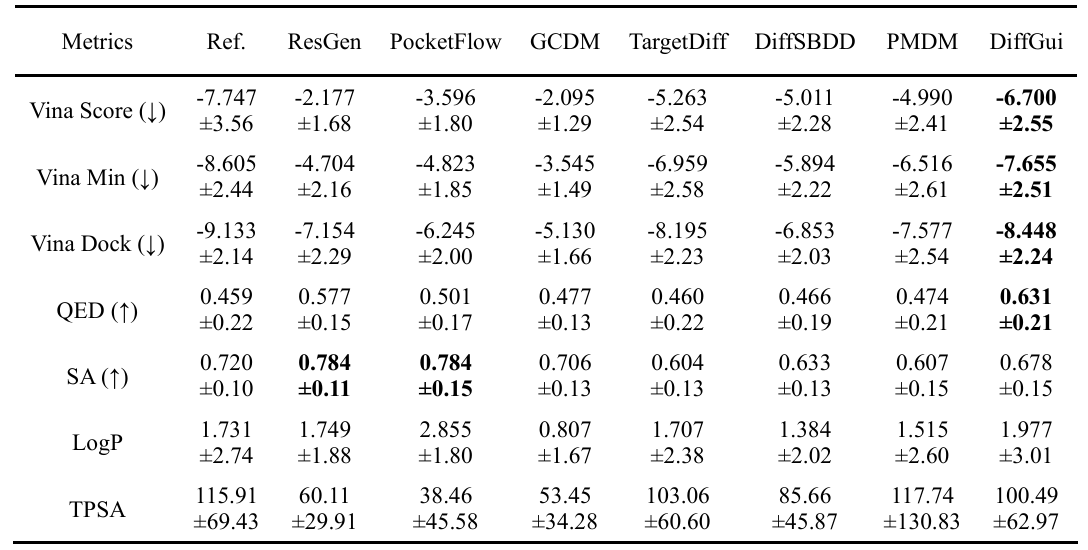 (3). 多属性引导: DiffGui 采用了无分类器的引导策略,在训练与生成过程中融入了多种重要的分子属性。模型引入分子的结合亲和力、类药性 (QED)、合成可及性 (SA)、脂水分配系数 (LogP) 以及极性表面积 (TPSA) 等多属性条件,引导生成兼具高亲和力与优良药物属性的分子。