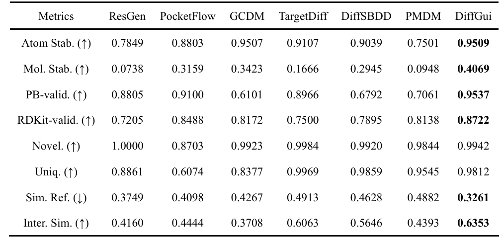 DiffGui在全新药物设计与先导化合物优化中的应用DiffGui已成功应用于全新药物设计与先导化合物优化任务,展现出优异的通用性与实用价值。