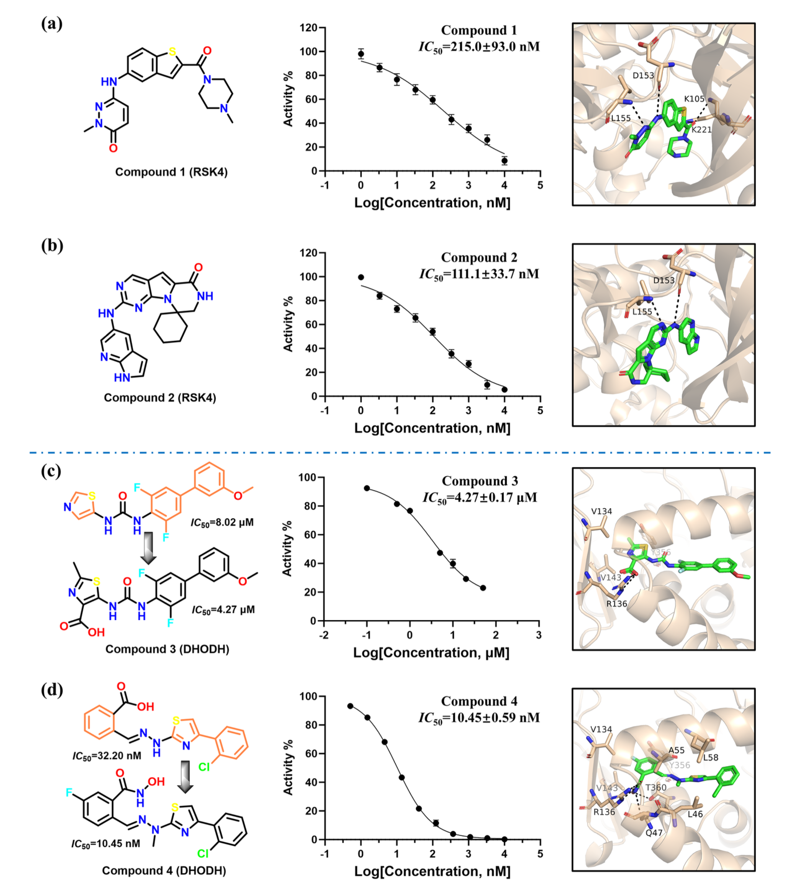 基于片段的先导化合物优化示例[1]更重要的是,湿实验验证进一步证明了 DiffGui 在药物发现实际应用中的潜力。针对未参与训练的 RSK4(核糖体 S6 激酶 4)靶点,DiffGui 所生成的两个化合物(化合物 1 和 2)在 HTRF 实验中均表现出强效抑制活性,IC₅₀ 值分别达到 215.0 nM 和 111.1 nM,显示出进一步开发的潜力。结合模式分析表明,这两个化合物均能够与 RSK4 结合口袋中的关键残基(K105、D153、L155 和 K221)发生相互作用。