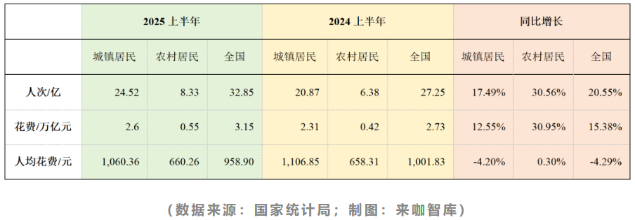 8月初,国家统计局发布了《2025年上半年国内居民出游数据情况》,与2024年上半年数据相比,呈现出两个有意思的变化:第一,出游人次同比增加20.55%,而总花费同比仅增加15.38%,通俗来讲就是,大家出去玩的更多了,但人均花的钱更少了;第二,农村居民的出游人次和花费同比增长均超过30%,远超城镇居民的增长幅度,并且人均花费还略有增长。这组数据可能与大家的直观感受相悖,但从中可以窥探到:消费降级的当下,旅游的逻辑也变了。