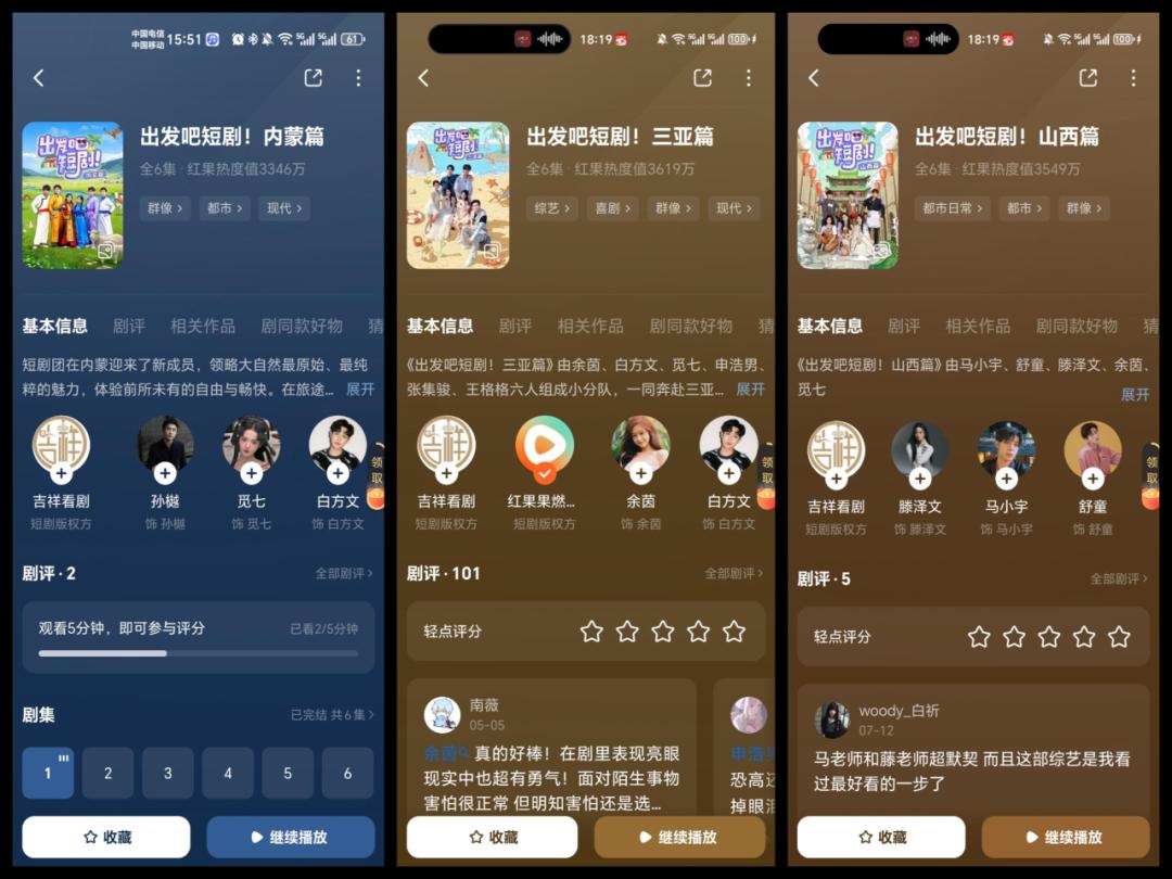 今年,红果短剧多次尝试涉足微综艺赛道,如推出了三季横屏户外旅行综艺《出发吧短剧》,分别在内蒙古、山西和三亚进行录制,参与嘉宾有孙樾、张集骏,余茵等短剧演员。