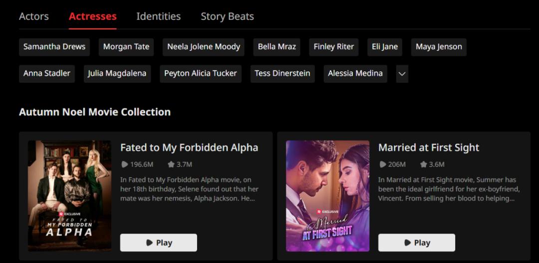 从ReelShort的分类来看,每一位演员都有单独的标签和对应的主演剧目,这与国内的红果短剧APP的生态布局有着微妙的“共鸣”。例如Autumn Noel 是 ReelShort 的御用女主,曾经出演过爆款短剧《Boss Me Around if You Dare》《Hillbilly Girl Marries A Billionaire》和《Secret Surrogate to the Mafia King》,在 ReelShort 平台上有一定的知名度,也能够吸引到部分观众观看。点击其相关标签按钮,即可了解其更多作品。