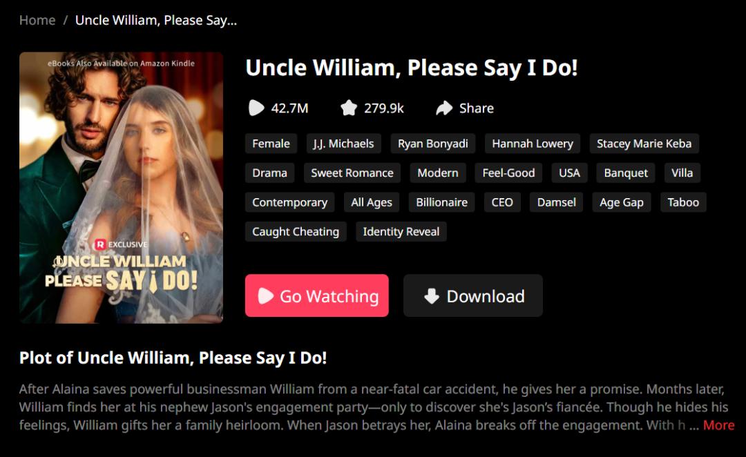 从播出数据来看,该微短剧在 ReelShort 上目前已经收获了2M+播放,4K+点赞,34.4K+收藏。