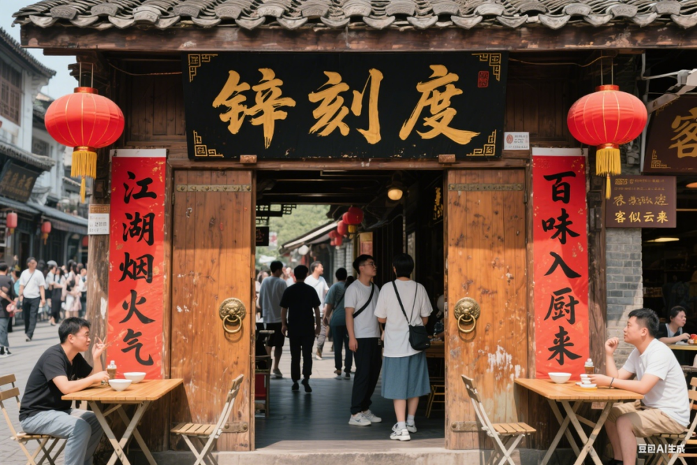 这些AI门头图的来头并不复杂。毕竟,在AI工具盛行的当下,许多AI生成软件都可提供类似的图片生成服务,比如“即梦”或者“豆包”,锌刻度在“豆包”输入“请生成一张以锌刻度为门头的江湖菜馆照片,体现出客人很多,门店很大气。”则得到以下图片: