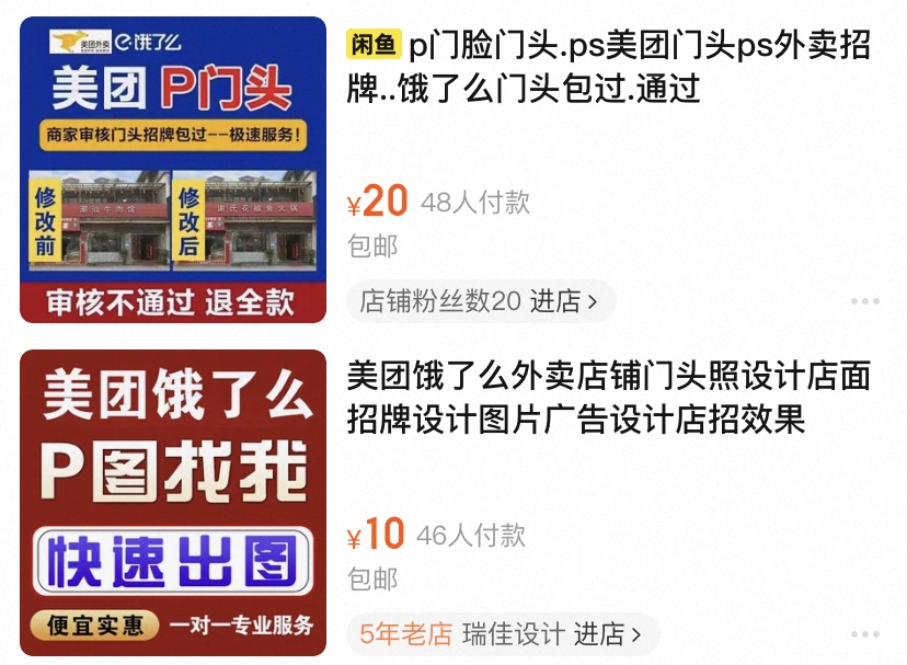 在淘宝等电商平台,就有不少商家提供“P门脸门头”“饿了么门头包过”等服务,价位在10元~40元不等,不少店铺总销量上千。除此之外,还有一些商家提供AI素材模板,从店铺招牌到头像logo再到菜品,应有尽有。