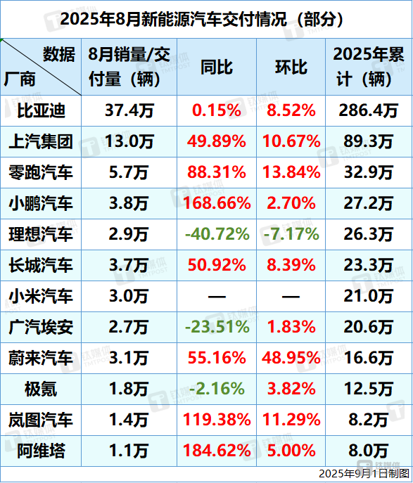 新能源汽车8月交付情况速览:7家交付量超3万,6家同比增超50%